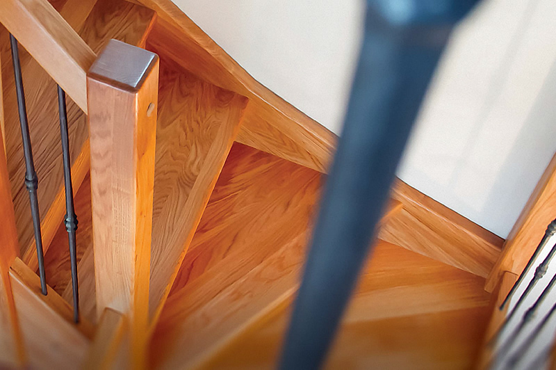 Stopnišče je izdelano iz masivnega hrastovega lesa. Ima obojestransko nosilno konstrukcijo. Je zaprtega tipa – ima nastopne in pokončne ploskve. Kombinacija lesa in oblikovanega železa daje ograji preprost a moderen videz.