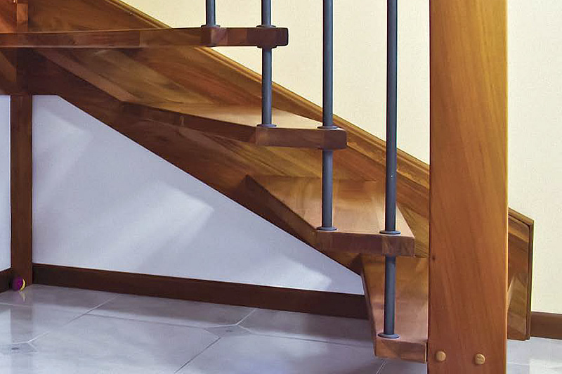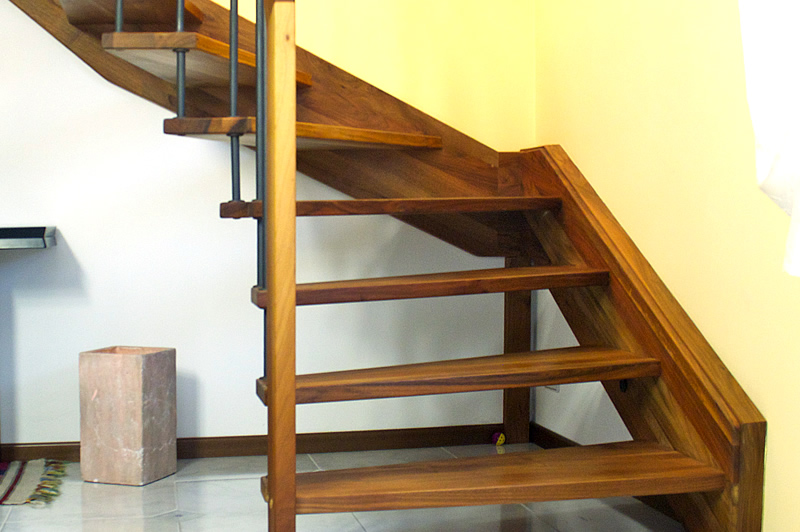 Stopnišče ima samonosilno konstrukcijo in nastopne ploskve iz plemenitega orehovega lesa. Stopnišče je lahkotnega videza, saj ima le zunanjo nosilno konstrukcijo. Zaščitno ograjo sestavljajo železni stebrički in lesen ročaj elegantnega videza.