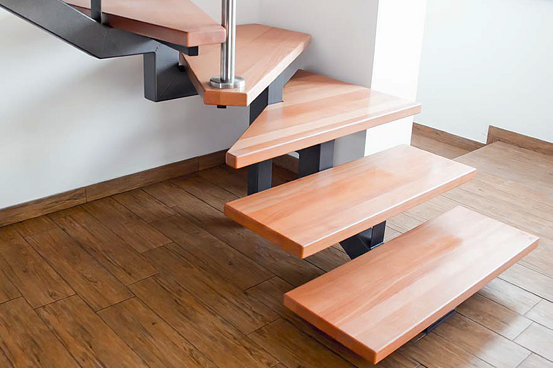 Samostoječe stopnišče s centralno nosilno konstrukcijo iz barvanega jekla. Nastopne ploskve so iz bukovega lesa. Zaščitno ograjo stopnišča sestavljajo nosilni stebrički, cevi premera 12 mm in ročaj premera 42 mm iz nerjavečega jekla.