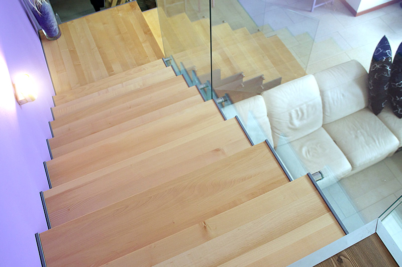 Samostoječe stopnišče z nosilno konstrukcijo iz barvanega jekla. Nastopne ploskve so iz javorovega lesa. Ograja iz kaljenega lepljenega stekla 6 + 6 mm.